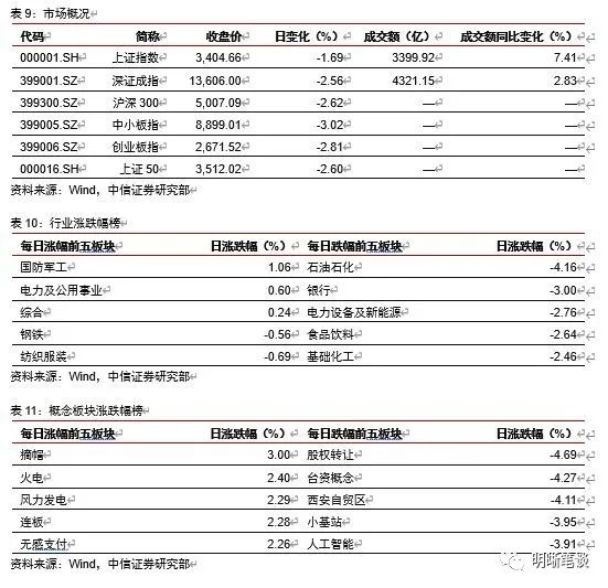 2021年3月19日,银存间质押式回购加权利率涨跌互现,隔夜、7天、14天、21天和1个月分别变动了-8.29bps、-0.2bps、7.5bps、3.13bps和0.13bps至2.11%、2.18%、2.41%、2.61%和2.67%。国债到期收益率整体下行,1年、3年、5年、10年分别变动-1.01bps、-2.25bps、-1.47bps、-2.28bps至2.64%、2.92%、3.05%、3.24%。上证综指下跌1.69%至3404.66点,深证成指下跌2.56%至13606.00点,创业板指下跌2.81%至2671.52点。