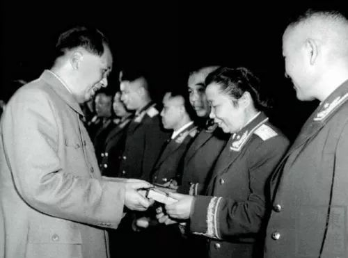 于是就有了这张照片,定格了李贞从毛泽东主席手中接过勋章的珍贵一刻。