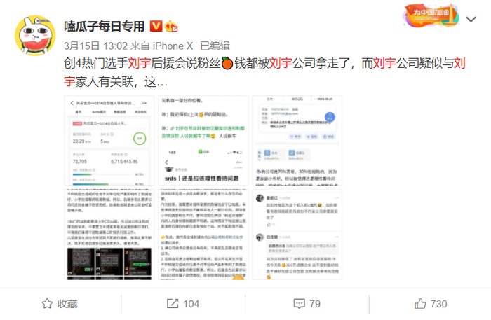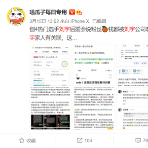 3月15日,刘宇粉丝发文称,粉丝集资的血汗钱被刘宇公司哔哟哔哟文化拿走,该公司与刘宇家人深度关联,粉丝质疑集资款被公司掌管后或许会被挪作他用。
