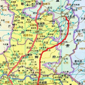 •清代河南地图局部,右为官道。从北京南下经华北平原穿越中原地区的纵线干道分为两条:一条由河北大名府至开州,又经河南滑县至开封府,再经朱仙镇至许州(今许昌),此为官道;另一条经河北邯郸至河南彰德府、卫辉府、荥泽至郑州,再经新郑而许州,两线汇合。两条分支与上文所言的横线干道相交于开封和郑州,形成两个交通节点,但是因为经开封和朱仙镇的线路较为平直,且是省会与首都间的官道,其重要性和繁华程度远高于后者,因而明清时期的郑州,交通优势还并不突出