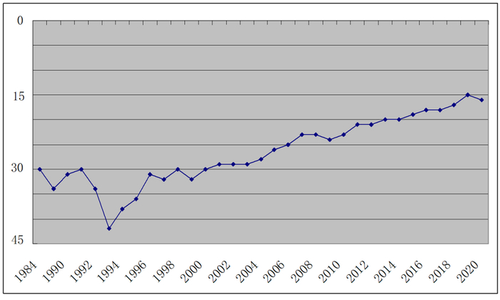 •近40年郑州GDP在全国城市排名中的变化表。其中2018之前统计含香港,2019数据自郑州市人民政府,2020数据自第一财经