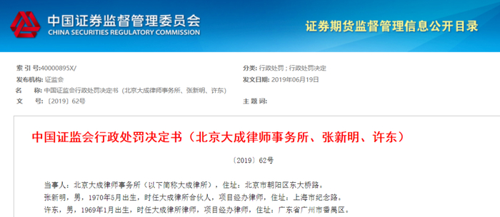2、中国证监会行政处罚决定书(北京大成律师事务所、张新明、许东)