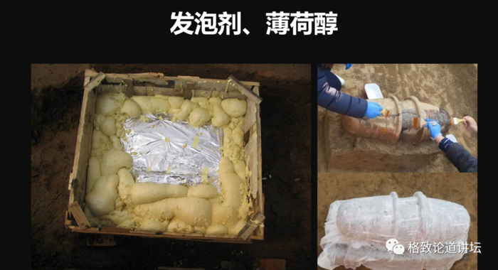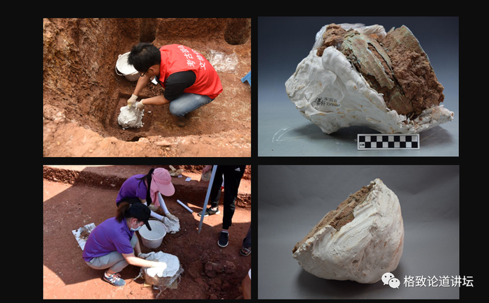 我们根据文物出土情况,一般采用比较多的就是石膏打包,左边两张是我们工作照,右边两张是我们发掘出土很多青铜器。