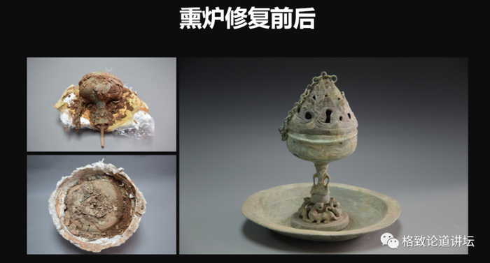 经过我们清洗、去锈、粘接、拼对、加固,对残缺位置进行补全,最后再做一些缓蚀封护之后,就是大家看到的左下角照片,修复之后的样子。