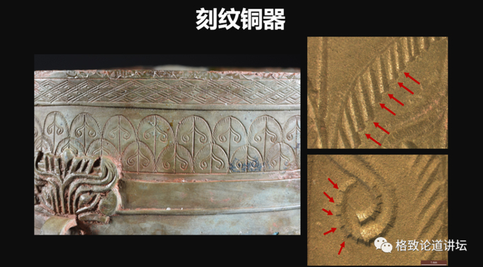 我们曾遇到一件温酒樽,它表面有很多纹饰,我们通过放大镜去观看,就是右边这两个显微镜下的照片,红色箭头位置是刻刀下去、出来。