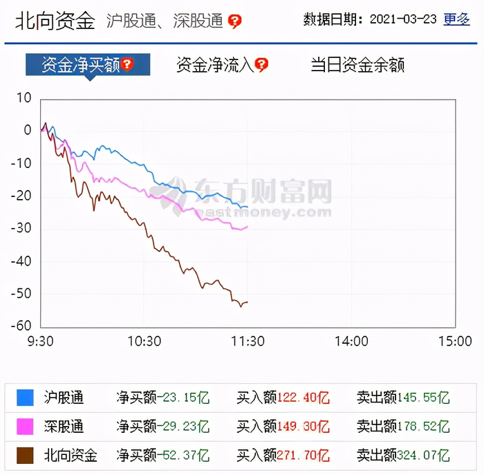 【北向资金加速流出 净流出52亿元】北向资金早盘持续流出,截至目前,净流出52.37亿元。