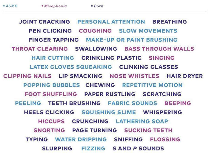 图中用紫色标识的声音是厌声症和ASMR共同的触发源。这两者的联系可能比你想象中更紧密—《大众科学》