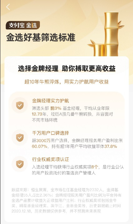 一家公司做到包揽金选好基前五,尤其是在今年以来这样的剧烈调整行情,确实比较罕见。据了解,支付宝精选基金的入围筛选非常严格,产品维度从规模、成立时间、风险收益特征、稳定性、多因子分析等方面进行评估;管理公司维度则衡量公司实力、投资管理能力、公司运作稳定性、风控能力、议价能力、市场影响力、盈利能力等;投资经理维度比较业绩管理能力、投资风格偏好、择时能力、行业偏好和市场适应能力等。