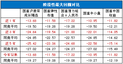 风险控制方面,我们同样以上述4个时间段来对比最大回撤,从绝对数字看,今年以来、近1年、近3年、近5年最大回撤都低于同类平均的有4只基金,分别是国富沪港深成长精选、国富弹性市值混合、国富中小盘、国富中国收益;