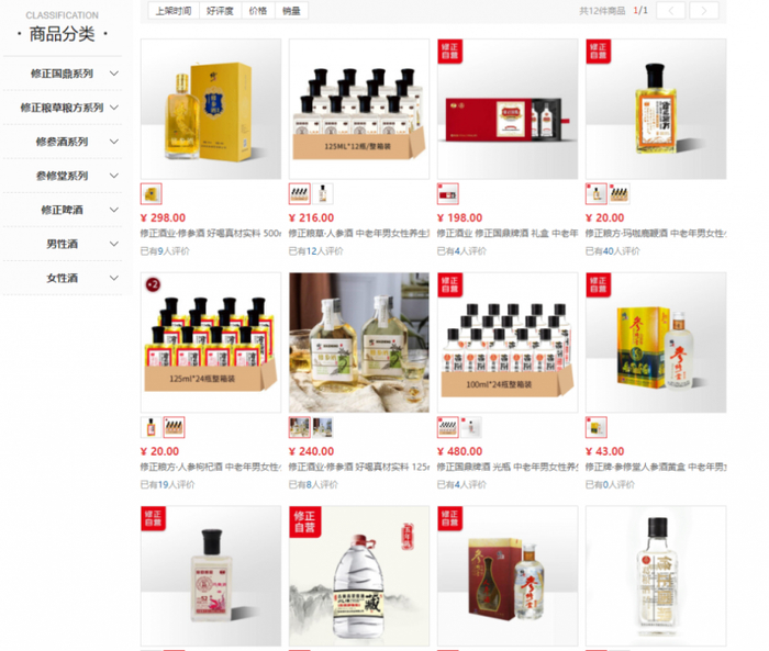 此前号称联合茅台推出的保健酒品牌“修正健酱”(又名健酱世家),目前已从各大线上渠道销声匿迹;与五粮液合作的葛根酒“修正国鼎”仍在京东修正酒类旗舰店售卖,定价28-480元不等,不过其消费者评价也寥寥无几。此外,观察其他几款修正酒品——修正粮草良方系列、修参酒、参修堂、修正啤酒,可以发现它们的消费者反响均不如人意。这其中情况稍稍好些的是修正粮方旗下的一款“玛咖鹿鞭酒”,评价人数40人。