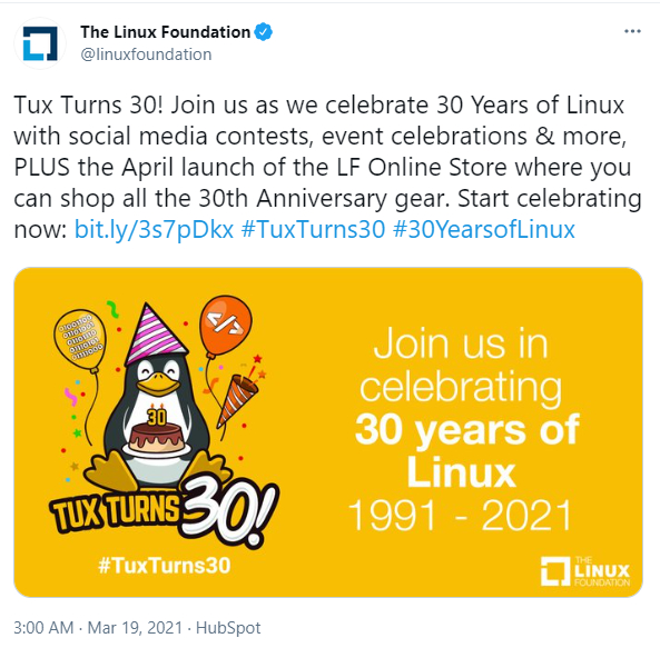 3月19日,Linux基金会在Twitter上发布推文宣布,其小企鹅的标志“Tux”已经30周岁了,还为其设计了一系列的庆祝海报,以便大家转发分享。