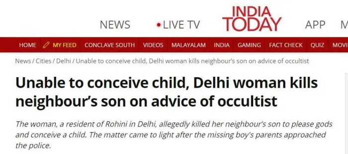 《今日印度》:因无法怀孕,德里一名妇女在巫术师的建议下杀死了邻居的儿子