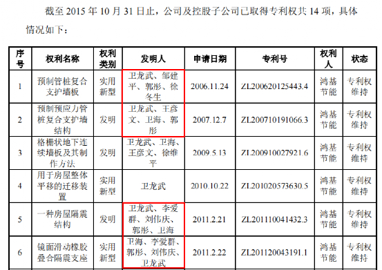 另外,上述核心技术人员中,卫龙武、卫海系父子关系,是鸿基节能的实际控制人。据鸿基节能新三板公开转让说明书披露,卫龙武于1975年9月至1991年8月在东南大学任教,历任土木系结构教研室副主任、结构研究所副所长。招股书称,卫龙武在1991年8月调离东南大学,离开后未在土木工程学院从事过实质性工作,土木工程学院未交付卫龙武任何科研任务和科研经费,卫龙武亦未利用土木工程学院相关物质条件进行过任何研究工作。