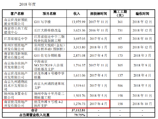 招股书显示,世茂集团是南京(鸿基节能所在地)销售排名前列的房地产开发商,报告期内与公司合作了12个项目。其中,“世茂外滩9号楼4-2地库支护”项目的合同签署日期为2016年12月,合同金额为1408.25万元,已于2018年10月验收并确认收入。