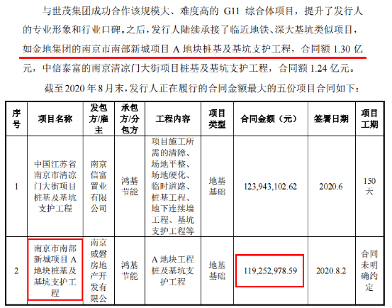 鸿基节能称,在与世茂集团成功合作G11综合体项目之后,公司陆续承接了临近地铁、深大基坑类似项目,如金地集团的“南京市南部新城项目A地块桩基及基坑支护工程”,合同额1.30亿元。但招股书在披露“重要合同”之“销售合同”时又称,“南京市南部新城项目A地块桩基及基坑支护工程”的合同金额为1.19亿元。