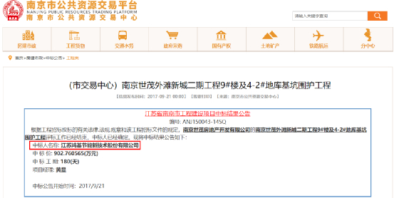 另据南京市公共资源交易中心披露,2017年9月,鸿基节能中标南京世茂房地产开发有限公司的“南京世茂外滩新城二期工程9#楼及4-2#地库基坑围护工程”项目,中标价为902.76万元。该项目是否即为招股书中的“世茂外滩9号楼4-2地库支护”项目?不过,招股书披露的项目招投标时间为2017年4月,合同金额为1408.25万元。