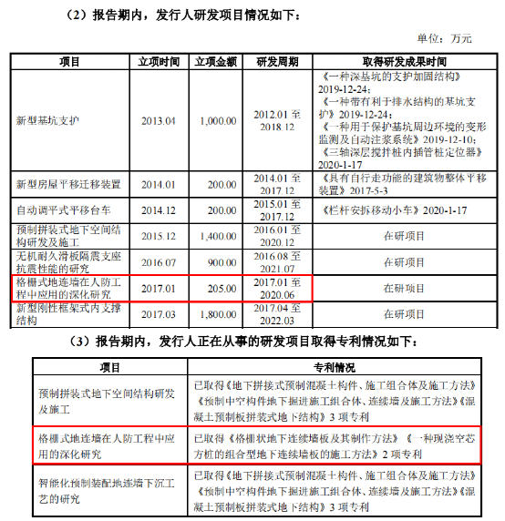 2017年1月,研发项目“格栅式地连墙在人防工程中应用的深化研究”正式立项,研发周期为2017年1月至2020年6月,已取得“格栅状地下连续墙板及其制作方法”、“一种现浇空芯方桩的组合型地下连续墙板的施工方法”2项专利。