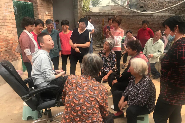 车窗外大片的玉米铺开,风沙也被扬得更高了,姚策很兴奋地提醒车里的其他人:老郭家的地盘就要到了!车到了门口,此前一直在哭泣的舅妈第一个迎到车门口把姚策接下来,坐在地上、靠在墙上的亲戚纷纷起身,随着人群往院子里涌。姚策被引到一张放在院子中间的皮转椅上坐下,亲戚们在距离他一米以外的空地上紧贴,在爸爸妈妈的安排下分布成三圈包围层。他们好奇、关心地看着姚策,一边在对身边的人说着什么。