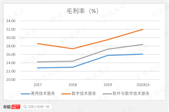 将上文的毛利率数据表转化为图形格式后发现,2017年-2020年9月,特别是2019年以来,通用技术服务、数字技术服务两大业务的毛利率明显提升,这也带动了软件与数字技术服务毛利率的提升。