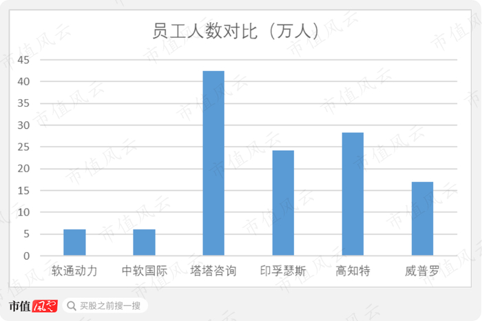 对比来看,软通动力、中软国际两家公司与他们之间还有不小的差距。其中,塔塔咨询的员工人数最多,拥有42.43万人,是软通动力的将近七倍;员工人数最少的威普罗,也有17.00万人,规模约等于三个软通动力。