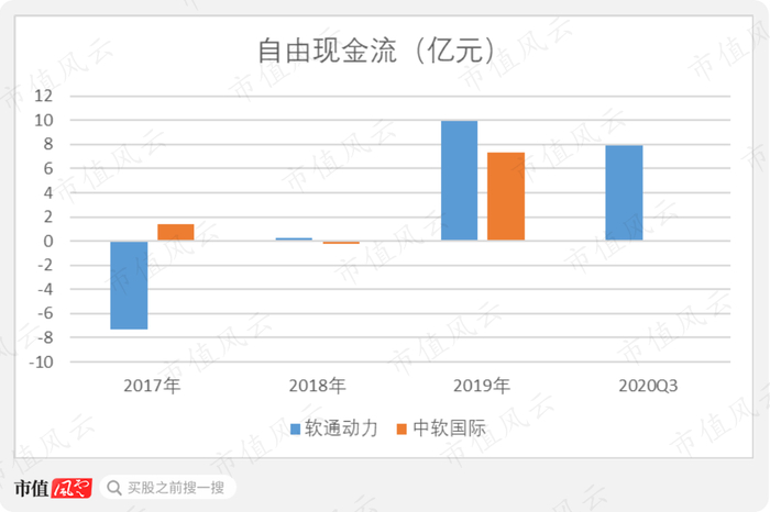 风云君发现,软通动力、中软国际的自由现金流都不是特别稳定,都曾在2017年、2018年表现为流出状态,在进入2019年之后才开始明显好转。