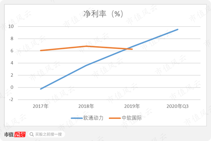 在毛利率和期间费用率两个因素的作用下,2017年-2020年3月,软通动力的净利率也持续快速增长,并在2019年超过了中软国际。