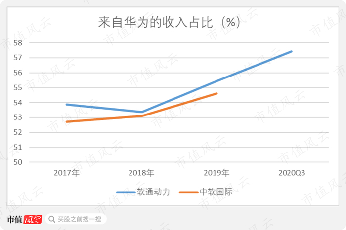 2020年前三季度,软通动力来自华为的营收占比也在持续增长,达到57.41%。