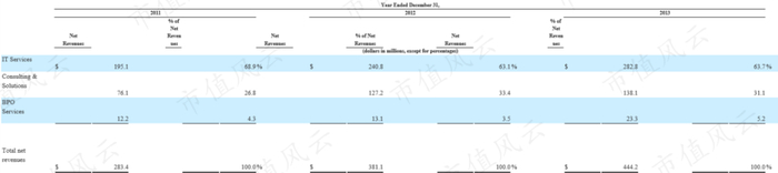 进一步分析后,风云君还是发现了一些细微的变化。以2013年为例,软通动力咨询与解决方案业务实现营业收入1.38亿美元,约折合人民币8.49亿元,占营业总收入的31.1%。