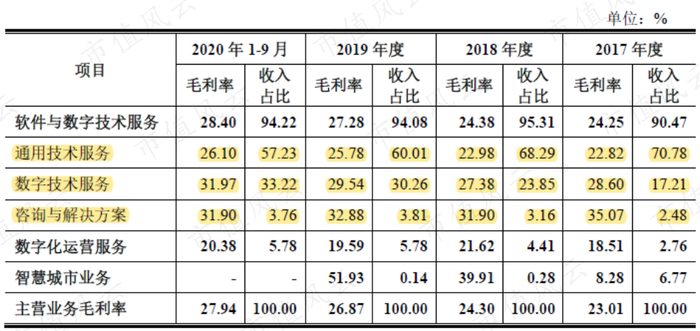 其中,软通动力的营业收入主要以软件与数字技术服务为主,2017年-2020年9月期间,均贡献了九成以上的营业收入。