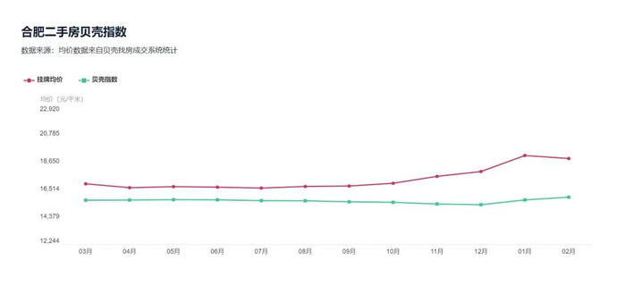 贝壳找房成交系统统计显示,从去年10月份开始到今年1月份,合肥二手房挂牌均价就持续走高,从16757元/平方米升至19099元/平方米,并且与贝壳指数差距逐渐加大。