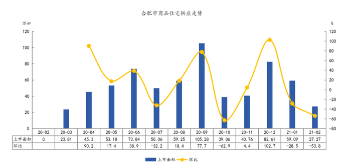 中指院统计显示,2021年2月,合肥市商品住宅新增供应27.27万平方米,环比下降53.8%。与此同时,合肥市商品住宅可售面积621.73万平方米,环比上升15.3%,按照平均近6个月销售情况,出清周期为6.82个月。而去年同期,合肥的商品住宅可售面积出清周期为21.98个月。