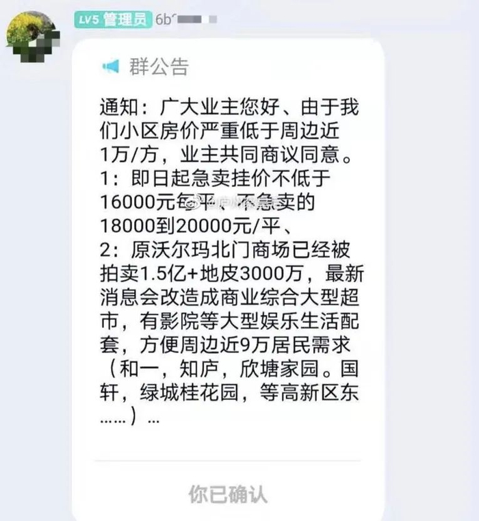 近日,一份关于博澳丽苑业主联合涨价的截图显示,有人呼吁:由于小区房价严重低于周边近1万元/平方米,建议即日起急卖挂价不低于1.6万元/平方米,不急卖的挂价不低于1.8万~2万元/平方米。