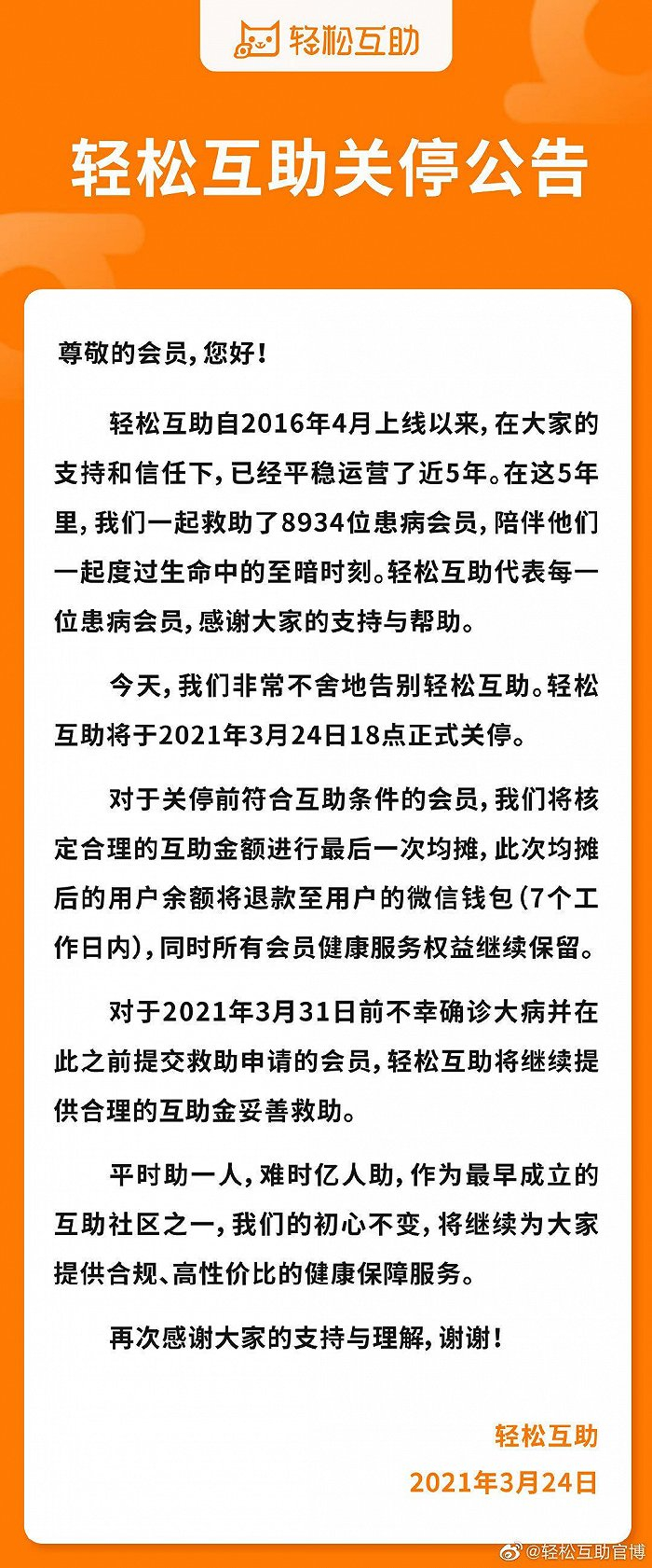 3月24日,轻松筹旗下的轻松互助宣布正式关停,成为继百度灯火互助、美团互助之后,近期第三家选择关闭的网络互助平台。
