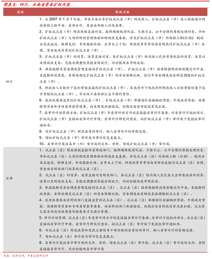 关于扩权内容,通常包括计划报送、财政管理、税收管理、项目申报、土地利用、统计数据发布等方面的内容。其中关于财政管理扩权的内容,我们对比四川和云南的措施来看,①财政收入:四川省规定,除上缴中央、省部份外,全部缴入同级金库;云南省规定,省财政确定试点县(区)的资金留解比例,资金调度由省财政直接调拨到试点县(区)。②预算、决算:四川省和云南省均规定,预决算报省财厅。③财政收入目标的下达和考核:四川省规定,省政府直接下达,市本级不再承担汇总平衡的责任;云南省未明确规定。④债务管理:四川省和云南省均规定,扩权试点县(市)举借国际金融组织贷款、外国政府贷款、国债转贷资金和专项再贷款等债务,向省财政承诺偿还,到期后由省财政结算或扣款。
