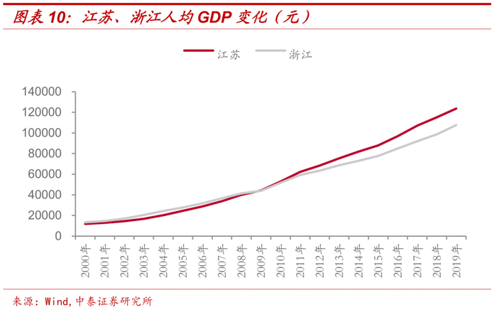 可以看到,2009年之后,江苏人均GDP开始超过浙江,且差距显著拉大,浙江因着力发展县域经济带来的优势逐渐被江苏超越。值得注意的是,近10年来江苏多次调整区划,通州、高淳、溧水、吴江、江都、姜堰、金坛、海门等撤县设区。浙江虽然也在进行撤县设区,但数量和步伐上都不及江苏。撤县设区后,原县域招商引资、产业布局、基础设施建设等纳入城市进行整体规划,更多的资源、人口向城市倾斜。可以认为,江苏人均GDP超过浙江,撤县设区、发展都市圈经济起到了一定作用。由此,对于经济较发展较好的省份,江苏和浙江撤县设区的举措或将可以借鉴,需要关注相关政策的调整对于区域经济发展的影响。