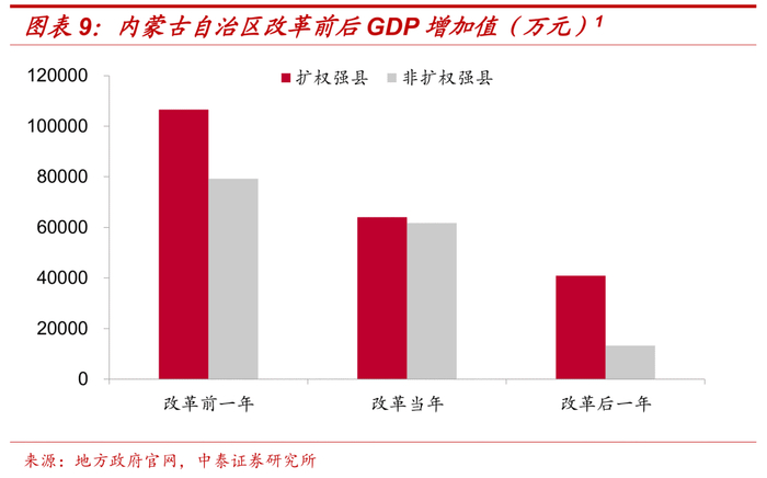从数据来看,内蒙古扩权县的地区生产总值较非扩权县并没有很大程度的变化,“扩权强县”改革对其经济发展的影响程度有限。