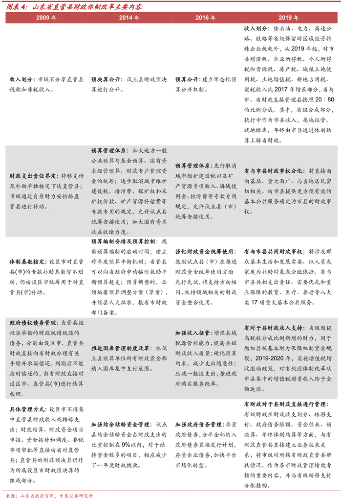 从山东省在直管县财政体制改革的主要内容来看, 2009年是对于财政管理的初级改革,2014年是对于县级预决算体制进行改革,2016年是对于县级预算体制进行细化,2019年是对于省、市、县在收入划分、财权事权划分、省财政的管理和支持方面进行全面改革。