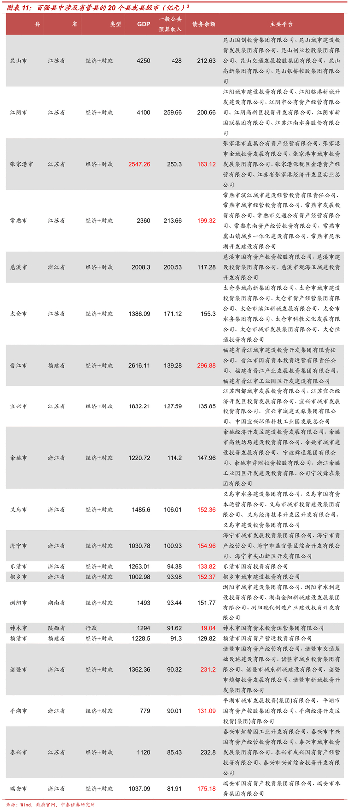 我们根据中国社会科学院财政战略研究院公布的《中国县域经济发展报告(2020)》[2]中全国县域经济综合竞争力100强名单,梳理了涉及省直管县改革的地区,共有69个县或县级市。我们选取了一般公共预算收入的规模排名前20个县或县级市,并给出了其区域内主要平台的名单。