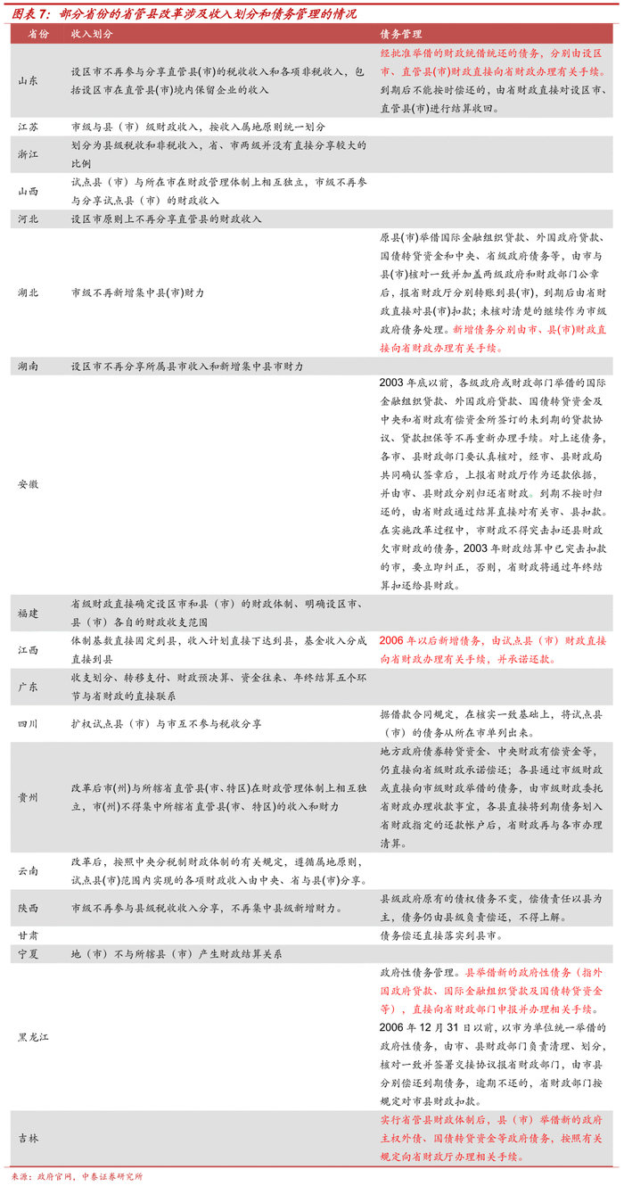 就各省管县财政改革中涉及财政收入划分、债务管理的情况,我们进行了简单汇总。