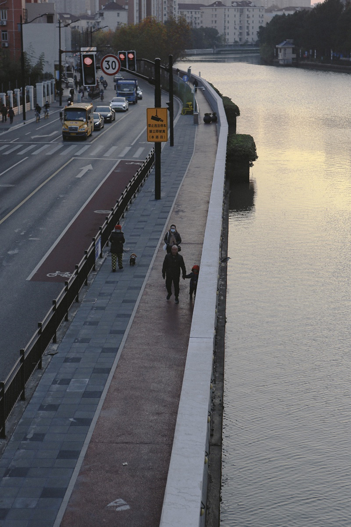 夕阳西下,牵手走在苏州河绿道的爷孙二人。季成摄影