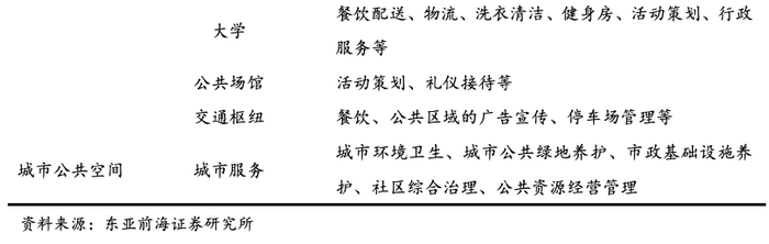 随着物业管理服务范围逐渐从狭义的社区空间走向广义的城市范畴,城市公共空间物业管理开始市场化发展。城市服务作为一个全新领域,其价值在于物业公司通过整合资源为城市项目运营提供一体化的公共服务解决方案。后疫情时代专业服务领域将加速引入社会化企业,随着城市公共服务治理市场不断向社会资本开放,城市服务的市场空间将逐渐释放。