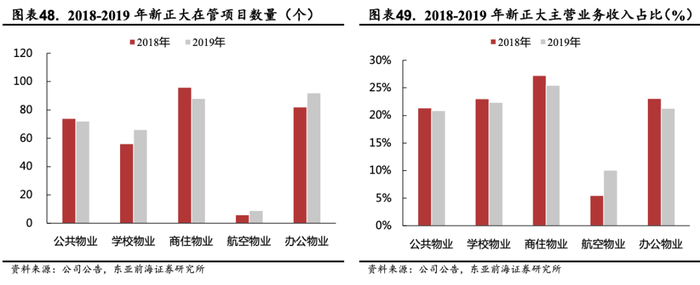 以新大正为例,作为典型的第三方非住宅物业企业,新大正在公建类这一更为垂直、专业的领域优势明显。新大正目前已经形成了包含学校物业、公共物业、航空物业、办公物业和商住物业在内的五大业态。其中,值得关注的是,2019年新大正将航空业态从原公共物业独立拆分出来重点培育,打造特色物业。2019新进驻3个机场项目,年合同金额近1亿元,同时深挖在管机场的延伸服务,实现当年营业收入同比增长约120%。截至2020H1,新大正航空业态已布局重庆江北机场、北京大兴机场、上海虹桥机场、广州白云机场等113个机场,作为重点培育业态发展顺利。新大正承接的重庆江北机场、北京大兴机场、重庆大学等项目有着极强的示范和带动效应,一方面对于提升公司自身管理水平有着很好的促进作用,另一方面也有助于公司未来在全国开拓类似项目。