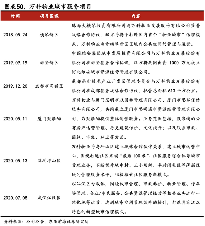 目前该领域涉足的物业公司数量不多,近年来万科物业、保利物业、碧桂园服务等龙头企业在城市服务方面开始布局,在环卫保洁、垃圾清运等基础内容以外,创新发展模式。以万科物业为例,万科物业的空间服务搭建了“三驾马车”模型,包括CS社区空间、BS商企空间以及US城市空间。万科物业的城市空间整合服务最早诞生于2018年,是基于珠海横琴“物业城市”的创新管理实践,推出的新型空间管理模式。该模式运用市场机制,通过“专业服务+智慧平台+行政力量”相融合的方式,对城市公共空间、公共资源、公共项目实行全流程“管理+服务+运营”,包含市政养护、物业管理、停车场管理、辅助城市秩序维护、市民生活服务等多领域业务。截至目前,万科物业“城市空间整合服务”模式已经陆续拓展至珠海横琴新区、雄安新区、成都高新区、青岛动车小镇、厦门鼓浪屿等处,承接当地的城市环境卫生、城市公共绿地养护、市政基础设施养护、社区综合治理、公共资源经营管理等城市管理业务。