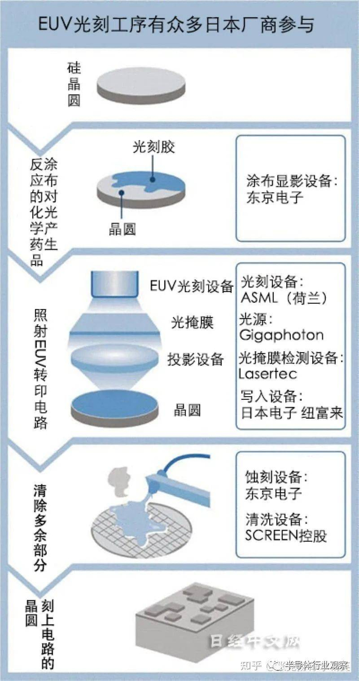 正如文章开头所说,虽然日本没有先进的晶圆厂,但他们在先进工艺的上游有很重要的布局。以现在炙手可热的EUV光刻为例,虽然大家都知道全球目前荷兰公司ASML能提供领先的EUV光刻机。但在半导体行业观察之前的报道中,我们可以看到日本公司在这个领域多个环节的实力。