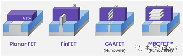 首先看台积电方面,去年媒体的报道显示,公司在在2nm制程工艺方面取得了重大突破,并将于2023年下半年进行小规模试产,2024年可大规模量产。从相关报道可以看到,台积电在2nm工艺上将放弃延续多年的FinFET(鳍式场效应晶体管),转向新的多桥通道场效应晶体管(MBCFET)架构,解决FinFET持续微缩带来的漏电问题。这正是三星在3nm上采取的方法。