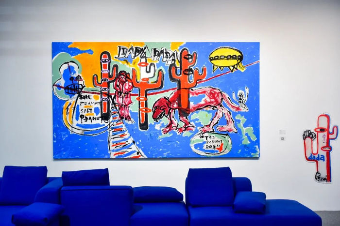 整个展厅被打扮成艺术家奶粉zhou的主题客厅,其中既有奶粉zhou的作品,还配以野兽派的家具、江南布衣的服装。