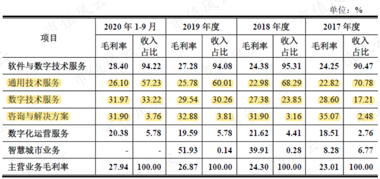 将上文的毛利率数据表转化为图形格式后发现,2017年-2020年9月,特别是2019年以来,通用技术服务、数字技术服务两大业务的毛利率明显提升,这也带动了软件与数字技术服务毛利率的提升。