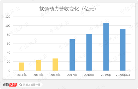 2017-2019年期间,软通动力的营收仍保持着持续增长的态势,并在2019年首次突破百亿元,实现106.05亿元。2020年前三季度,软通动力实现营业收入92.12亿元,整体受疫情影响较小。