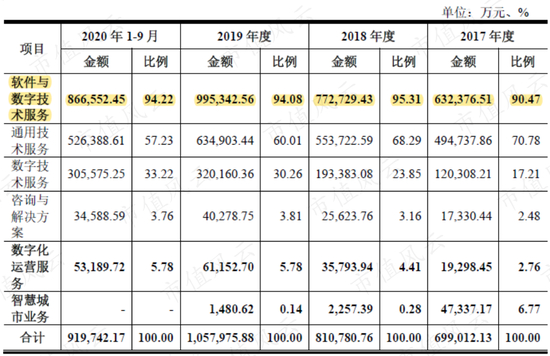 其中,软通动力的营业收入主要以软件与数字技术服务为主,2017年-2020年9月期间,均贡献了九成以上的营业收入。