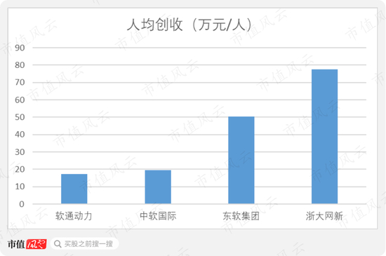 不过,从另一组数据上,剧情似乎又有些反转。在2019年人均创收排名上,软通动力、中软国际反而明显落后,东软集团、浙大网新优势尽显。